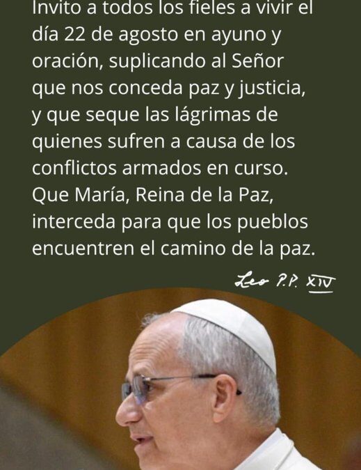 El Santo Padre León XIV ha convocado una jornada de oración y ayuno por la paz este 22 de agosto, memoria litúrgica de Santa María Reina.
